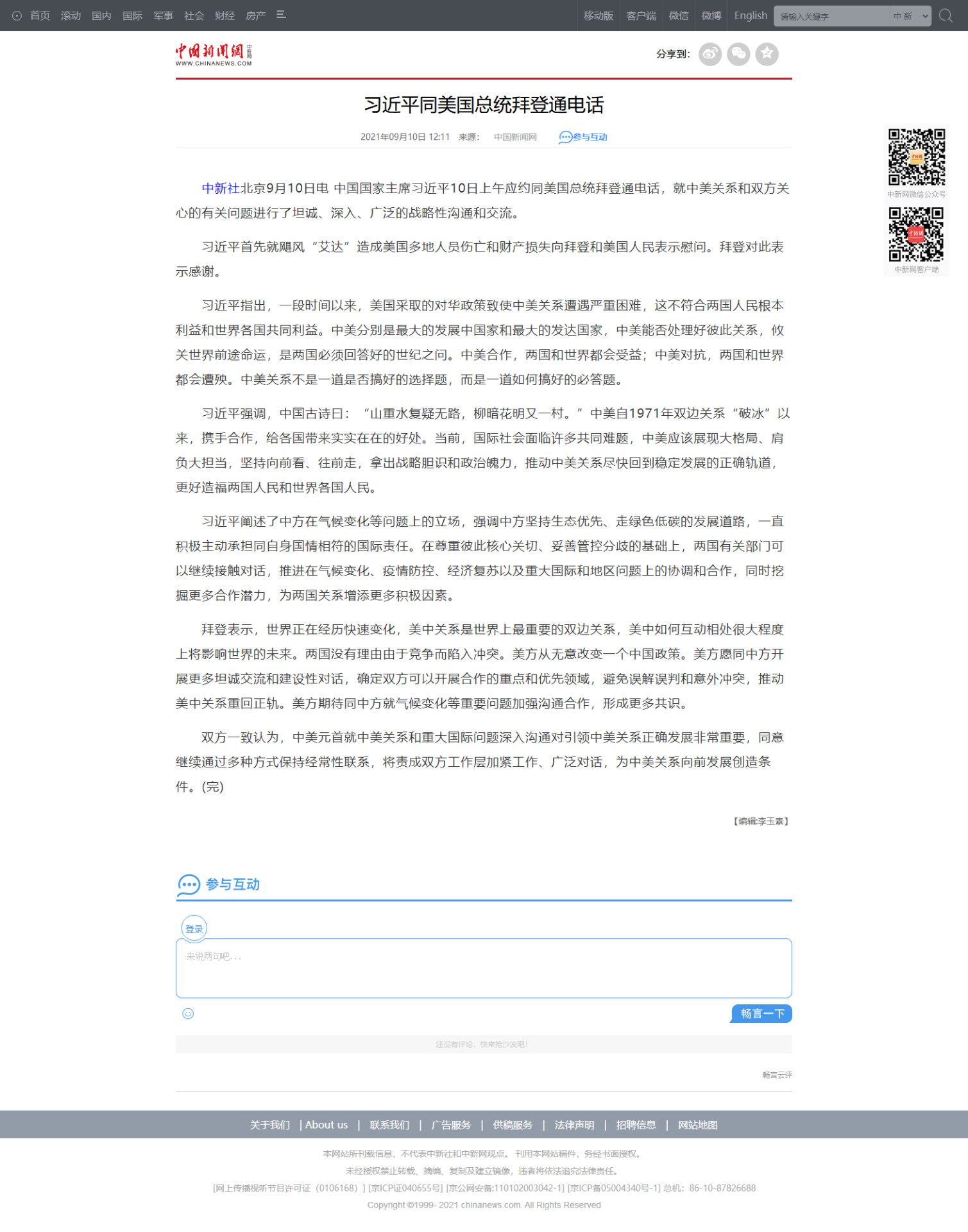 查看詳細(xì)習(xí)近平同美國(guó)總統(tǒng)拜登通電話2021年09月10日 12:11 來(lái)源:中國(guó)新聞網(wǎng)參與…